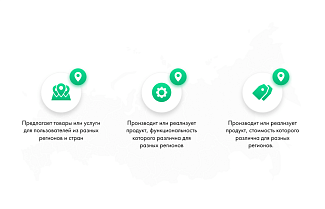 ![]() Предлагает товары или услуги для пользователей из разных регионов и стран | ![]() Производит или реализует продукт, функциональность которого различна для разных регионов | ![]() Производит или реализует продукт, стоимость которого различна для разных регионов |